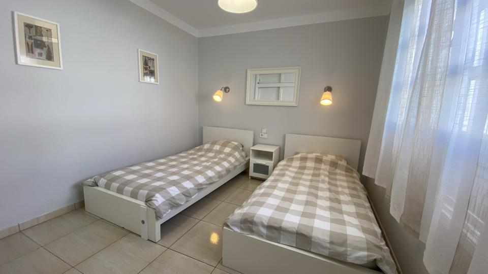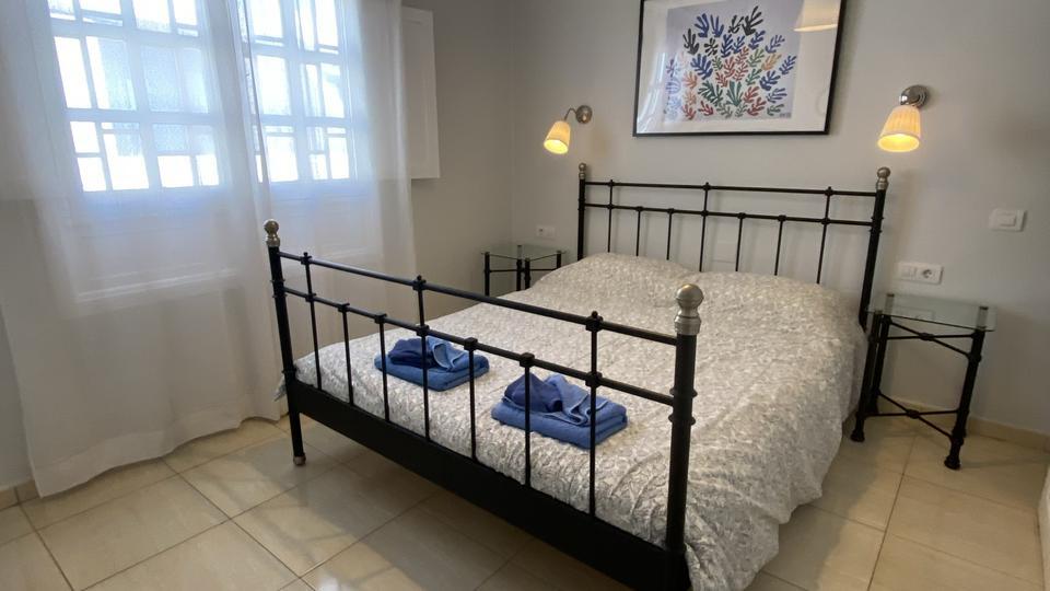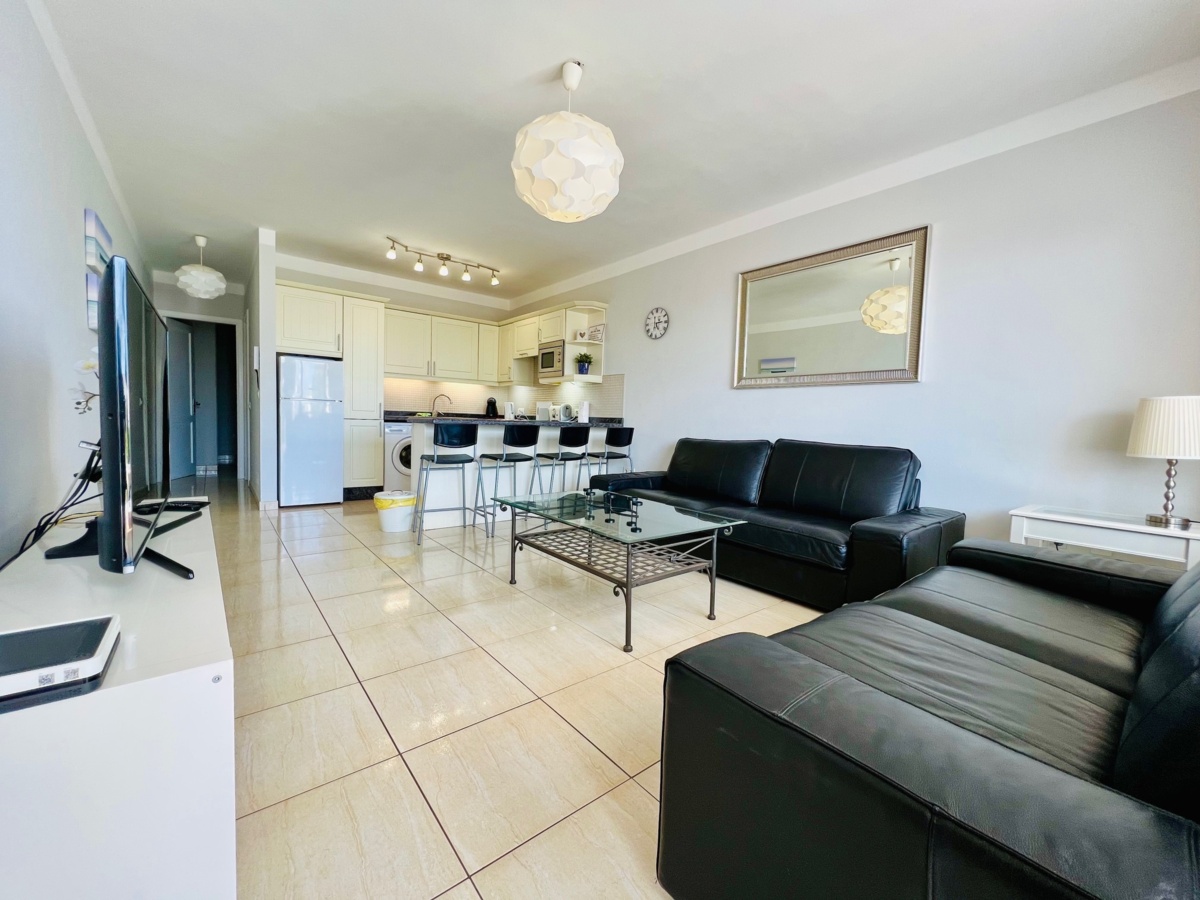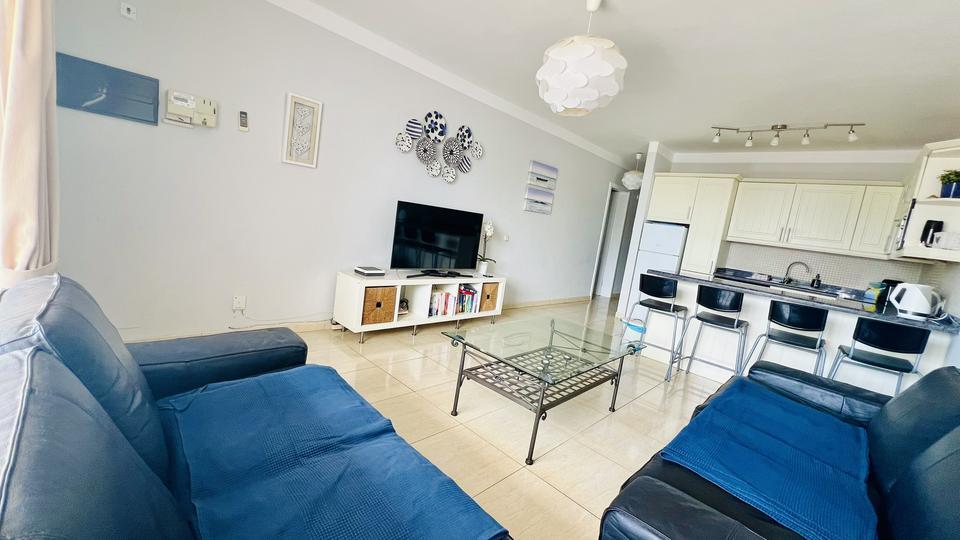 Featuring air conditioning and fibre optic WiFi, the apartment is thoughtfully equipped for relaxation and entertainment. The master bedroom boasts a king-sized bed (160x200), en-suite bathroom, built-in wardrobe, and fan, while the second bedroom includes twin beds, a bedside table, a fan, and built-in storage. A family bathroom provides additional convenience with a shower, toilet, and wash basin.