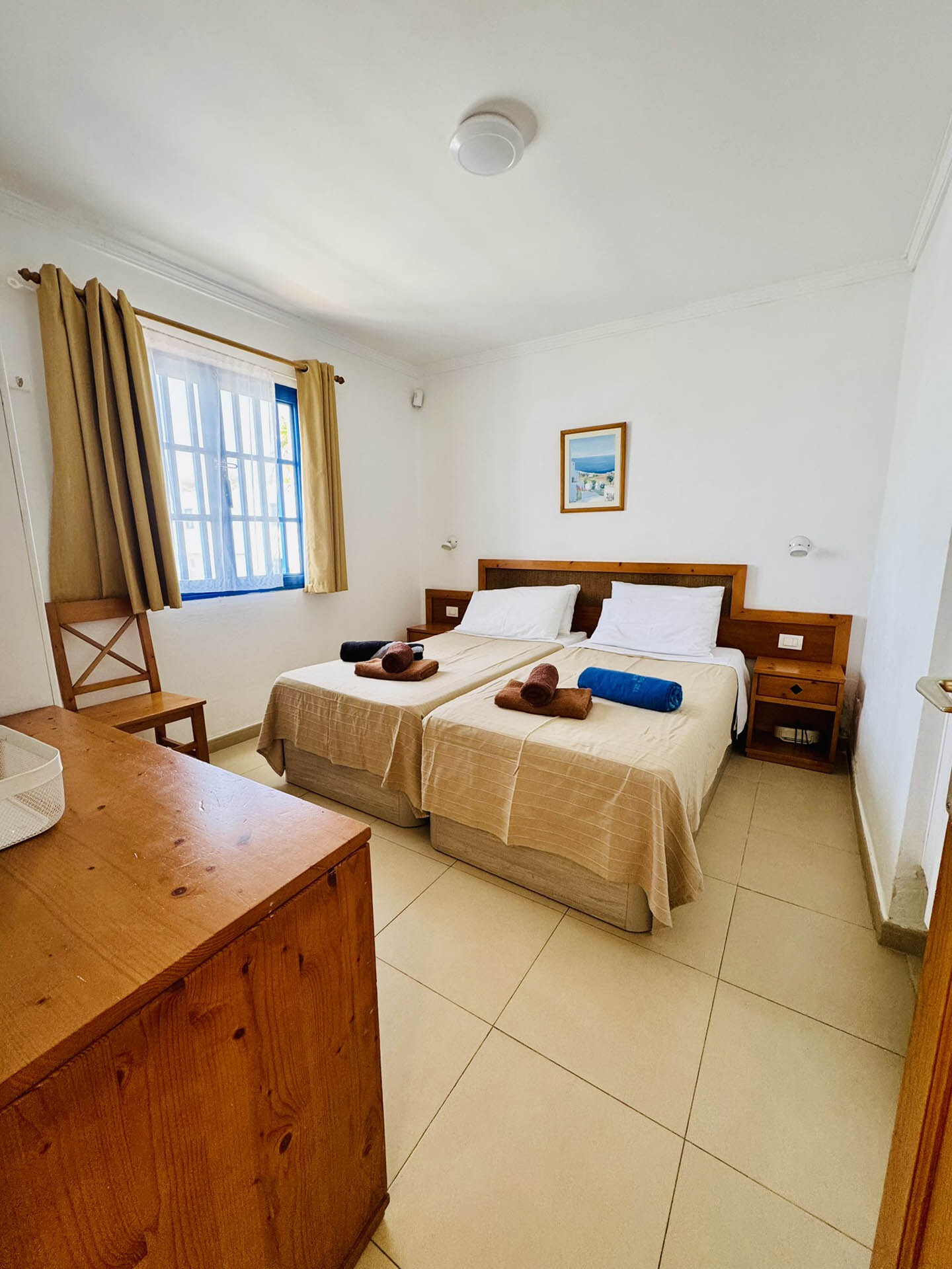 Each bedroom features two single beds pushed together to form a large double, complete with dressing table, mirror, bedside tables, blackout curtains, and ample storage space (good-sized wardrobe with hangers).